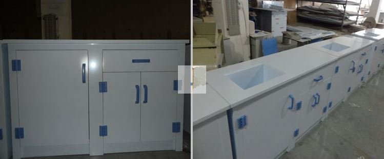 2)柜体抽面与门板:采用12mm厚(土灰或)瓷白色耐酸碱优质纯料PP(聚丙烯)板制作。