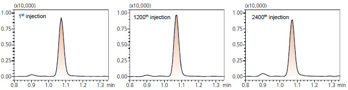 阿普唑仑的第1次、第1200次和第2400次进样测定的MRM色谱图