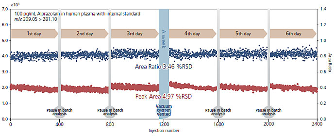LCMS-8060改进的离子光路耐用性实验:历时6天,每天400个样品,连续进样2400个fg水平的阿普唑仑人血浆样品(样品前处理为蛋白沉淀)。峰面积响应的RSD%为4.97%,面积比的RSD%为3.46%。作为耐用性测试的一部分,真空系统的瞬间断电对于信号响应或基线噪音没有影响。