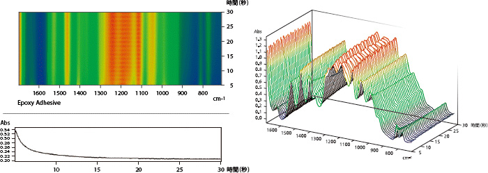 丙烯酸酯系等紫外线固化树脂如果受到紫外线照射,则由于自由基聚合在较短的时间内发生固化。照射强紫外线则在数秒内进行大部分固化反应。因此,为了跟踪短时间内进行的反应,需要使用具有高速扫描功能的FTIR。高速扫描可在1秒内获得20枚红外谱图,因此,可以精细地观察数秒内完成的固化反应过程。