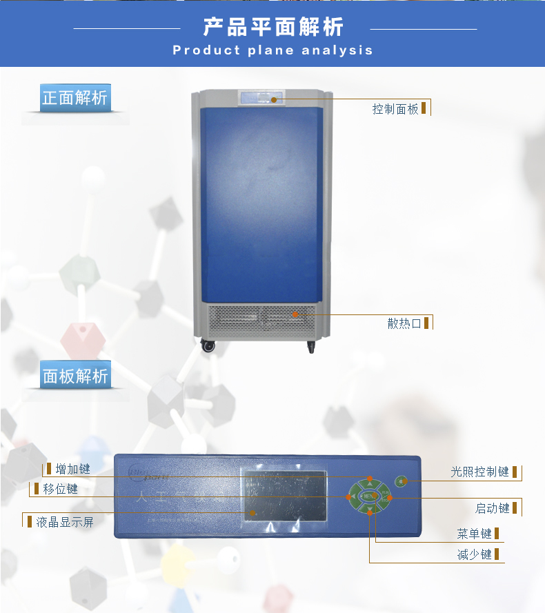 ● 微电脑程序控制温度、湿度、光照度,可模拟白天及黑夜的温度、湿度变化,也可选择生长环境充足稳定的光源。