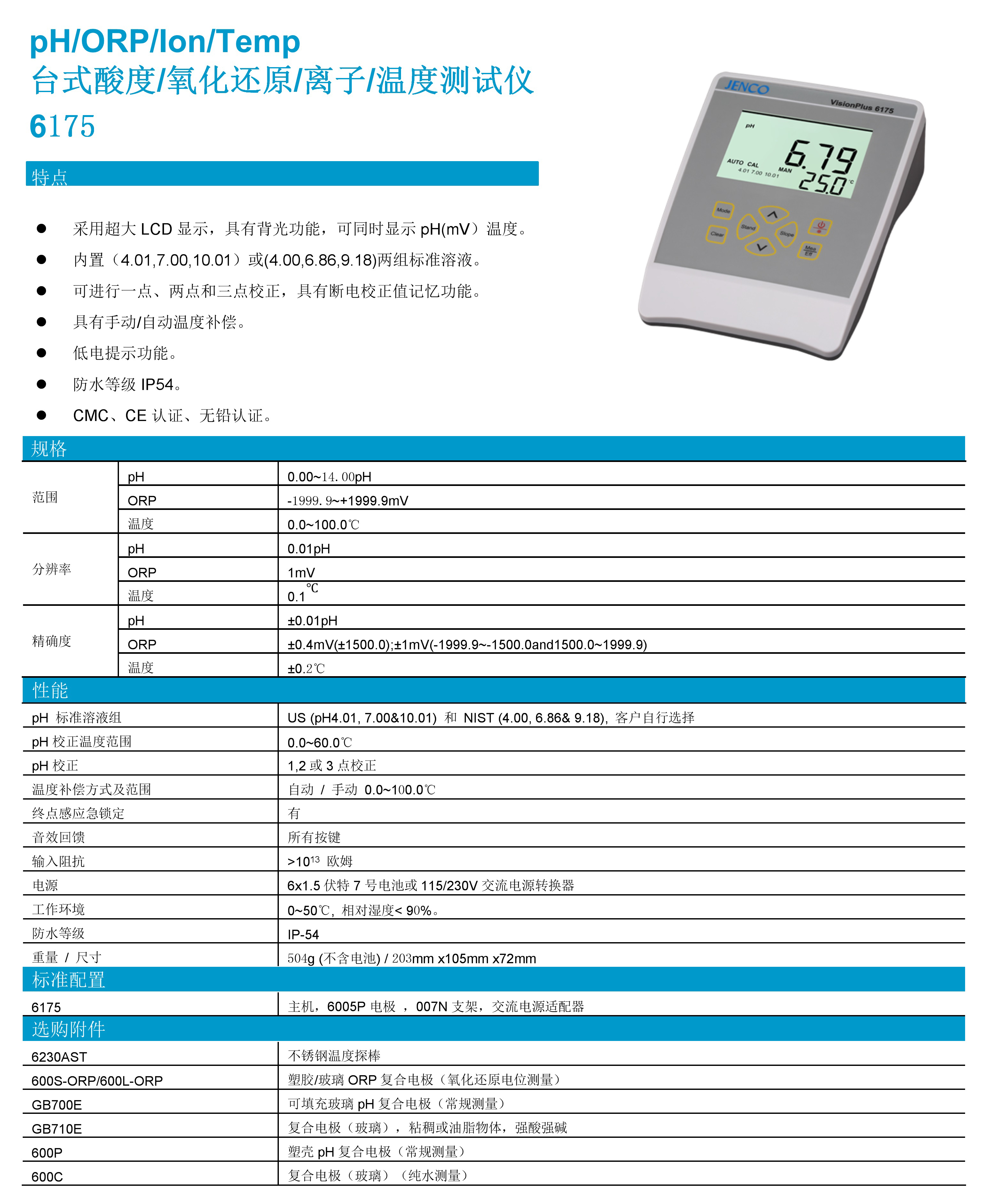 下一页:pH/ORP/Temp 台式酸度/氧化还原/温度测试仪 6175-3C