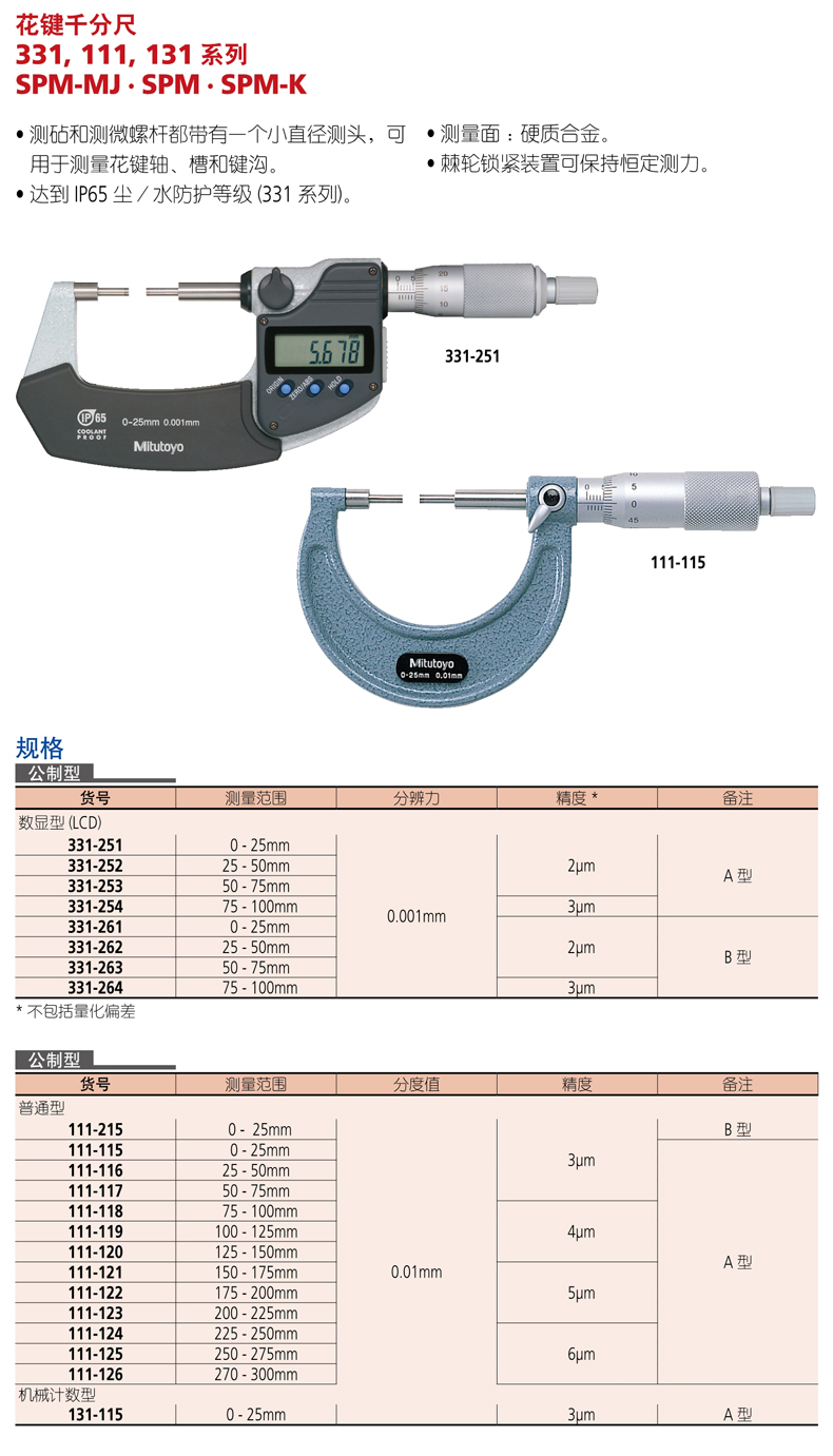 日本mitutoyo三丰花键千分尺331,111,131系列SPM-MJ·SPM·SPM-K