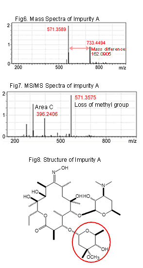 与C区(396.2386)理论图相比,m/Z=396.2406的质量差为0.002。M/Z=571也进行了检测,它是类似于ERY-AO的MS/MS谱图。然而,杂质的分子量是733,杂质A和从该损失之间的杂质的质量差是162。而从地区ERY-AO质量差是14.0144。使用精确质量计算器,这个数字被认为是CH2(14.0156),并假设杂质有一个结构,从一个区的甲基A组,以一个氢取代。