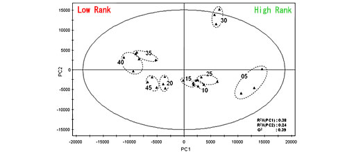 分别从MS1的分析中提取峰和使用峰信号强度值创建峰列表。峰保留时间排序,同位素峰消除, p值过被应用到3798个检测到的峰值中,从中提取出479个显著峰值。然后把数据输出到商业的多变量分析软件中( SIMCA-P, Umetrics开发 ) 。