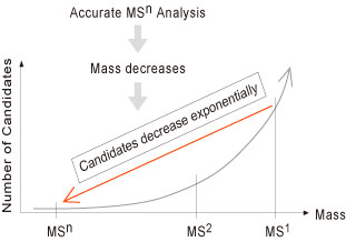 在组成预测中,目标成分有一个小的质量和质量精度,其测量值,提供数量较少的候选化合物和提高预测的可靠性。当使用公式预测的信息丰富的MSn 数据软件时,公式预测从子离子中最小的质量的离子开始,并使用在母离子的候选数量减少的有效预测结果。