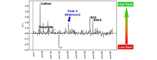 主要成分轴( PC1)的PCR量值图(显示每个成分对茶叶品质的贡献率),显示了大量高级茶叶所含的成分呈现正值。
