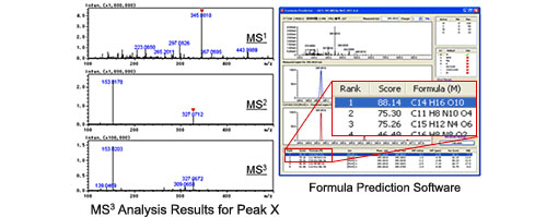 当利用LCMS-IT-TOF的0.1秒高速质谱采集并且与HPLC在线联机进行分析时,仅需一次分析,就能够获取MS谱,MS/MS和MS/MS/MS的谱图。LCMS-IT-TOF组成预测程序(正在申请专利)有效的缩减了备选代谢物,不止使用同位素方法和还参考了MSN谱精确确的质谱信息。这就是该系统对于解决代谢最艰巨的任务,识别发现的代谢物并有力支持应用代谢学的项目的成功(如寻找生物标志物)的巨大作用。