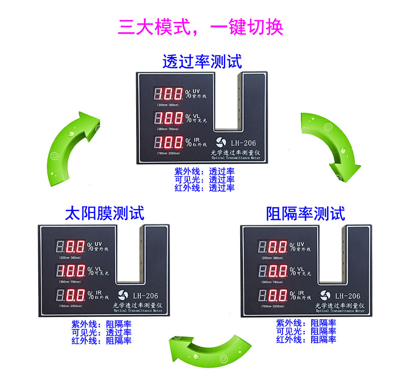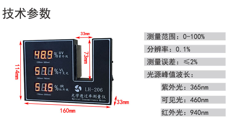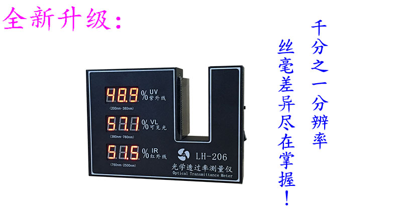 LH-206 是一款高精度光学透过率测量仪,专业用于测试玻璃、太阳膜、PVC等产品对于红外线、可见光和紫外线的透过率测量,同时也可用于其他透明材料的测量..